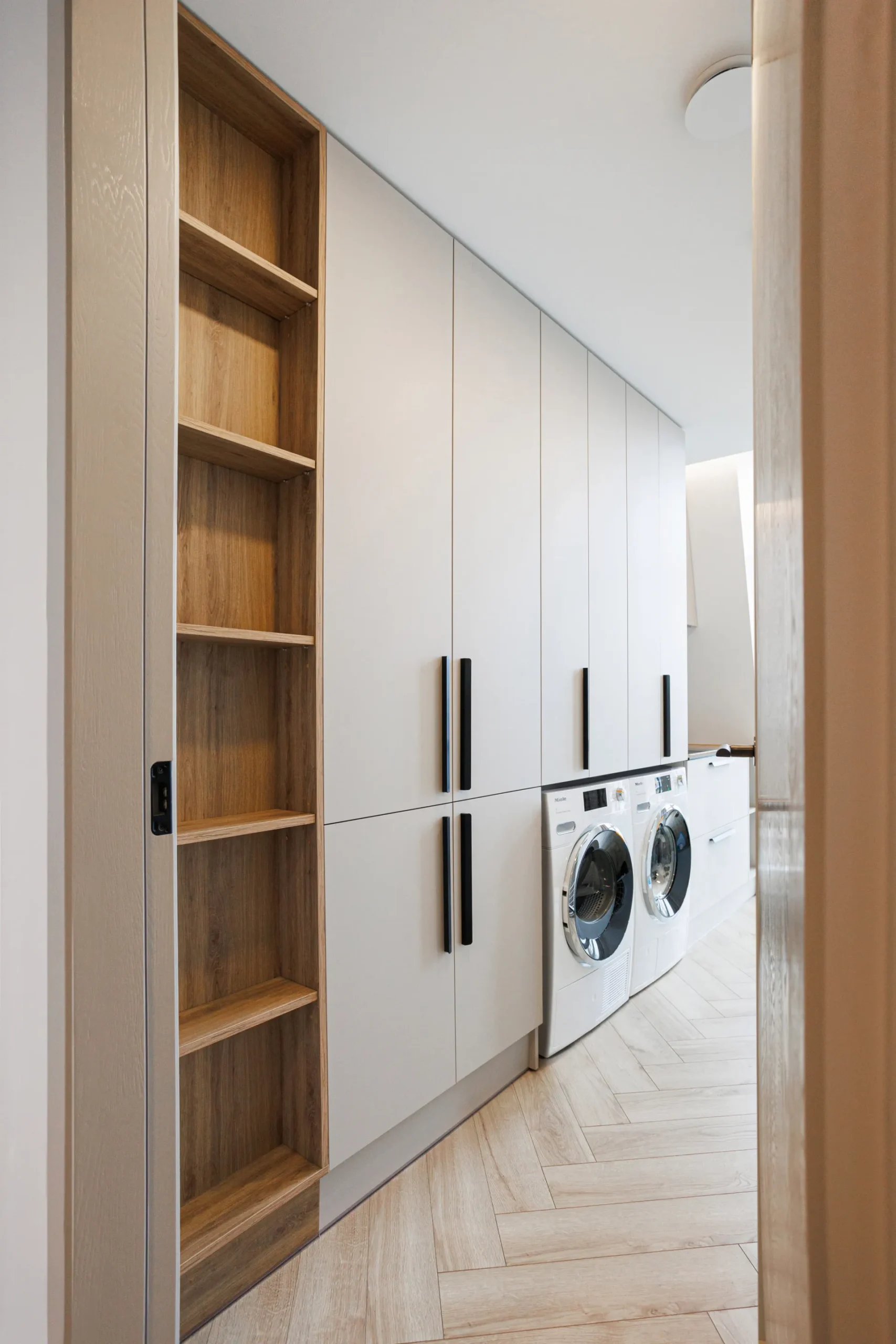 In de badkamer draait alles om optimaal gebruik van de ruimte. Handdoeken en verzorgingsproducten krijgen een vaste plek, netjes weggewerkt achter strakke fronten. Het resultaat is een badkamer die rust en stijl uitstraalt.
